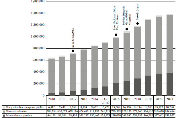 El caso del AMSS no es la excepción, como se muestra en la figura 4 para el 2021 el parque vehicular nacional era 1,38 millones de vehículos con una clara tendencia a la alza, a pesar de diversos proyectos de infraestructura como el BRT SITRAMSS (Nevo et al., 2016), la construcción de pasos elevados así como la formulación de una Política Integrada de Movilidad y Logística Nacional (MOPTVDU, 2017), históricamente ningún proyecto o acción política ha logrado revertir esta tendencia que contrasta con datos como los del reparto modal de 70 %-30 % transporte público y vehículo automotor, que se mantiene vigente desde PLAMATRANS (1997) hasta la Política Metropolitana de Movilidad Urbana (COAMSS-OPAMSS, 2020).