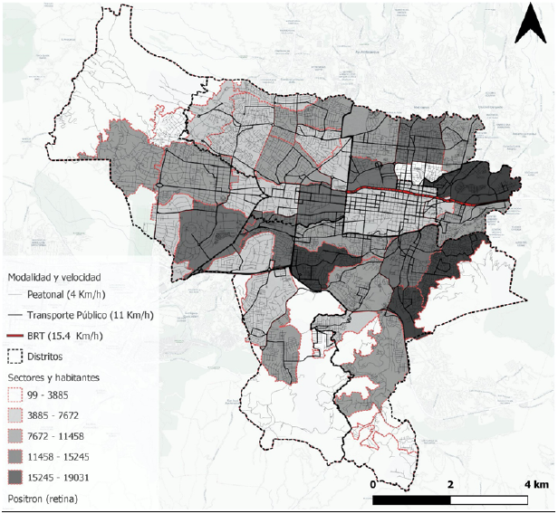 Dadas estas limitantes, se construyó un modelo de la situación en QGis representado en la figura 8, este modelo incorpora la red vial del sistema de transporte público y la movilidad peatonal considerando desplazamientos en vías de transporte público con una velocidad comercial de 11.5 km/h (Nevo et al., 2017, p. 40), 15.4 BRT (Global BRT Data, 2021) y para la movilidad peatonal de 4 km/h, con ello el cálculo de sus respectivas impedancias en minutos es factible.