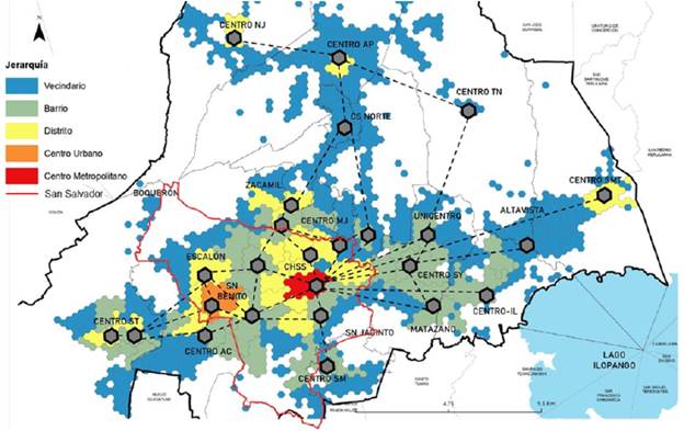Como resultado, se muestra en la figura 9 que el AMSS está compuesto por un sistema policéntrico con un claro predominio del Centro Metropolitano conocido como Centro Histórico de San Salvador, cercano a este se encuentra también el centro Urbano de San Benito. Adicional, se han identificados 21 Centros de Distrito concentrados en su mayoría en los municipios de Santa Tecla, Antiguo Cuscatlán y San Salvador, aunque también cabe destacar aquí los casos de Zacamil, Centro de San Martín, Apopa y Nejapa. Finalmente, del ejercicio se lograron identificar también 41 barrios y 83 vecindarios como se muestra en la tabla 4.
