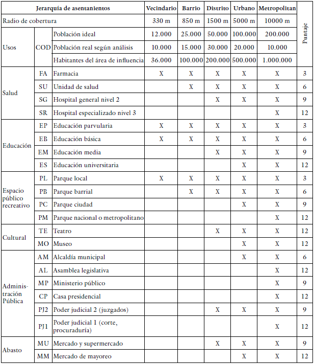 El segundo proceso consiste en establecer un sistema de puntajes para cada sector con base a la proximidad y jerarquía del sistema de equipamientos del AMSS (educación, salud, espacio público, cultural, administración pública y abasto) que se muestra en la tabla 1. Esta tabla representa la totalidad de las tipologías existentes y está dada por el nivel de especialización de los equipamientos (i.e. Centros educativos, de parvularia, primaria, secundaria y educación superior) y por lo tanto algunas zonas tendrán un mayor puntaje que los llevará a ser considerados centros metropolitanos o urbanos, mientras que otras centralidades desprovistas de equipamientos principales, sin importar su cantidad poblacional podrán ser consideradas barrios o vecindarios.