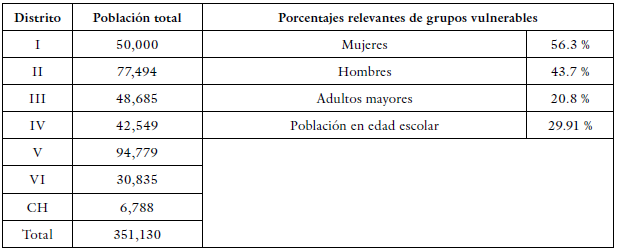 En cuanto a la población y su distribución se utilizan las capas vectoriales de sectores, 43 en total, cada sector solo se tiene la información de la población, otros datos como los porcentajes de mujeres, hombres y otros grupos que se pueden considerar vulnerables se muestran en la tabla 3, solo a municipal. El promedio de área de la segmentación de sectores es de 166 ha con los cuales se generarán indicadores proxi de poblaciones vulnerables.
