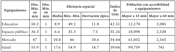 En contraste con estos datos proporcionados por las isócronas, la tabla 5 muestra una batería de indicadores de accesibilidad centrados en determinar la equidad y eficiencia espacial que brinda el municipio de San Salvador a sus habitantes. Los resultados del modelado en el software Flowmap indican que no es posible brindar servicio en cada equipamiento urbano a todos los pobladores de San Salvador, esto se muestra en la columna "Población con accesibilidad a equipamientos mayor a 60 min.".