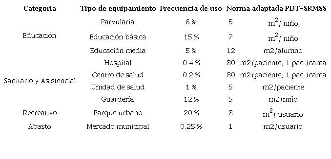 Además, se obtuvo datos sobre la localización de los equipamientos urbanos para la escala municipal como las clínicas de salud, escuelas, espacios públicos y mercados en formato de capas vectoriales. La capa de espacios públicos tenía como atributo área de metros cuadrados, útil para estimar capacidades según se muestra en la tabla 2, dichas capacidades se calculan para cada equipamiento según su tipología y se consignan en un campo de la capa vectorial para su respectivo proceso.