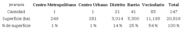La suma de los valores registrados por cada campo de cada hexágono permite establecer una jerarquía metropolitana en función de los puntos obtenidos por estar dentro la zona de influencia de un determinado servicio. Las zonas obtenidas en función de las puntuaciones se clasifican como: Vecindario, Barrio, Distrito, Centro Urbano y Centro Metropolitano.