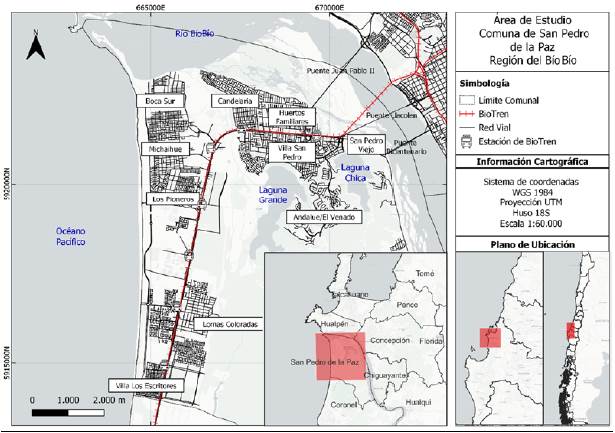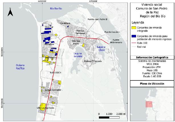 Teniendo en cuenta estos elementos, este trabajo analiza el caso de la comuna de San Pedro de la Paz, ubicada en la región del Bío Bío, Chile. El territorio es además una comuna vecina de Concepción, capital regional, que hace parte de lo que conocemos como Área Metropolitana de Concepción (figura 1). San Pedro de la Paz reúne estas formas de urbanización periférica, donde la política habitacional ha tenido un rol crucial en dicho proceso.