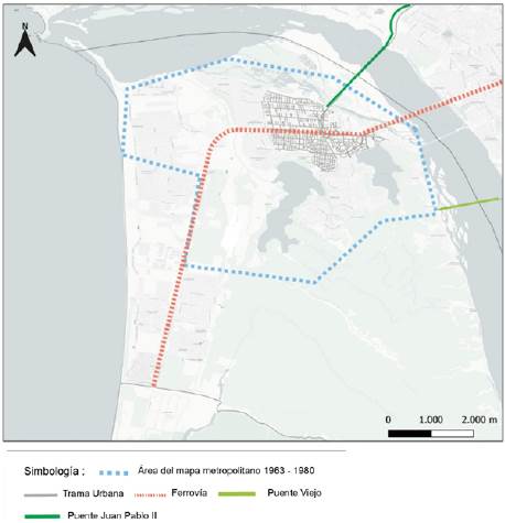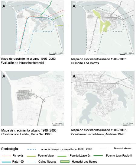 Con un centro aún difuso, en este periodo se produjo una periferia en torno a la clase social, cuyos protagonistas son el Estado y el mercado. La periferia popular se caracteriza por la construcción de espacios subsidiarios, homogéneos, desprovistos de servicios y desconectados de las incipientes zonas de centralidad que emergieron alrededor de los ejes estructurantes. La periferia acomodada es exclusiva y excluyente, se separa y distingue del funcionamiento de la ciudad, recibe apoyo estatal a través de la normativa y la construcción de infraestructura que le permite estar fácilmente conectada al centro de Concepción y al aeropuerto. En la figura 3 se puede observar el crecimiento de la ciudad y la evolución de la trama urbana de este periodo.