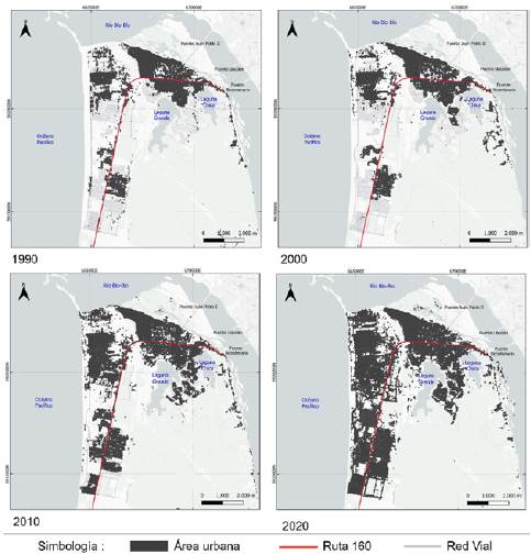 El análisis de cobertura de uso del suelo determinó que el área urbana de San Pedro de la Paz se duplicó entre 1990 y 2020 (figura 4). En 1990 la mancha urbana cubría 936.2 hectáreas de un total de 12 500, lo cual representa un 7,5 % de la superficie comunal. Hacia el 2000 el suelo urbano ocupaba 961.3 hectáreas, un 7,6 % de la superficie comunal. En 2010 la superficie de suelo urbano cubría 1430.8 hectáreas, lo que corresponde a un 11,4 % de la superficie total comunal. Finalmente, en 2020 la superficie de suelo urbano es de 2019.9 hectáreas, un 16,5 % de la superficie total de la comuna de San Pedro de la Paz.