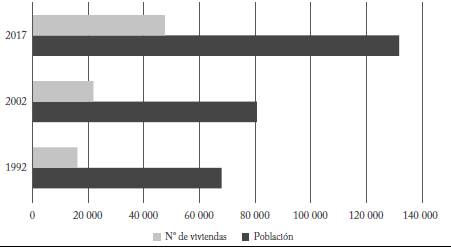 La superficie de suelo urbano fue creciendo de forma sustancial, con un aumento leve en el periodo 1990-2000, el cual fue seguido de un fuerte crecimiento a partir de la primera década de los 2000, que la consolidó como una de la comunas con mayor crecimiento urbano y demográfico de la región del Bío Bío. Al respecto, la población comunal se incrementó desde los 67817 habitantes en 1992 (Salinas & Pérez, 2011) a los 131808 habitantes en 2017 (Censo, 2017), aumentó un 94 %. A escala residencial también se pudo identificar este aumento. Según el Censo, en 1992 San Pedro de la Paz contaba con 15916 viviendas, que aumentaron a 21699 en 2002 para registrar 47511 viviendas en 2017 (figura 5). En ese año, un 49 % de los habitantes ha estudiado entre 12 y más de 18 años, lo que evidencia el atractivo de la comuna para las clases medias.