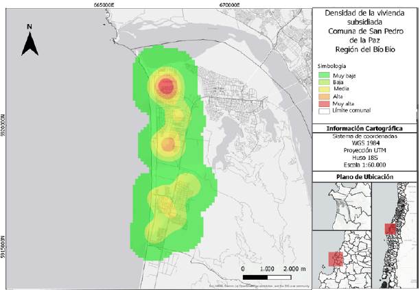 Un segundo eje utiliza la información pública disponible de capas de información vectorial de la vivienda subsidiada por el Estado entre 1990 y 2020, según los datos entregados por la plataforma de Información de Datos Espaciales (IDE) del Ministerio de Vivienda y Urbanismo (MINVU). A partir de esta información se construyeron cartografías de la ubicación, concentración y densidad de la vivienda subsidiada de la comuna de San Pedro de la Paz.