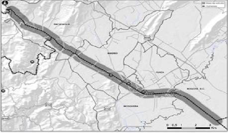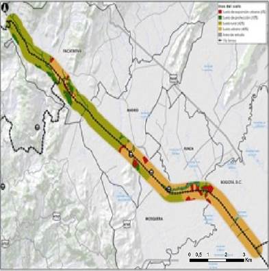 En la fase de síntesis fueron compilados los datos obtenidos en el proceso de investigación para que, a través de su integración, se pudieran observar los componentes específicos en el área de estudio. Para el análisis, se comparó la cartografía digital del sector occidental de la Sabana con el programa ArcGis, como se mencionó anteriormente. El área de estudio se determinó trazando una zona de amortiguación de 1 km de ancho a cada lado de la vía férrea desde su eje, que resultó en un área total de influencia directa de 8852.5 ha (figura 3).