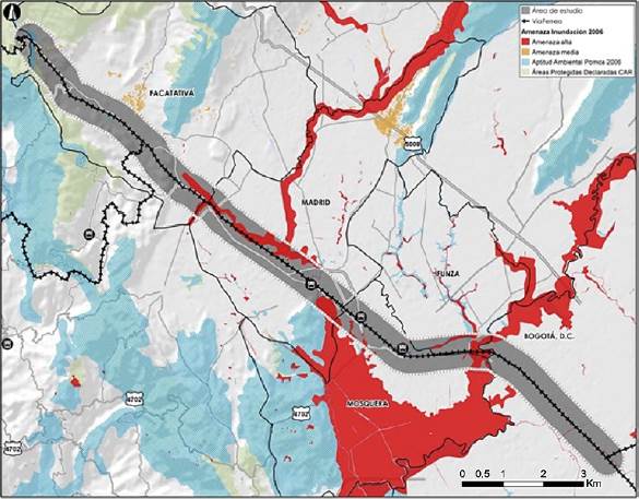 Al realizar los cálculos para el 2006, se obtuvo que de las 412.7 ha del área de expansión, 113 están amenazadas por inundaciones. Existen cinco datos de amenaza alta que comprenden un total de 61.3 ha, que corresponde al 15 % de la superficie total de suelo de expansión. En cuanto a la amenaza baja, se tiene un total de 51.2 ha, el 12 % del área de expansión. La zona más afectada por amenaza alta y baja se encuentra en el municipio de Madrid, aunque también existe una superficie de 26.8 ha entre el municipio de Mosquera y Funza con amenaza alta.