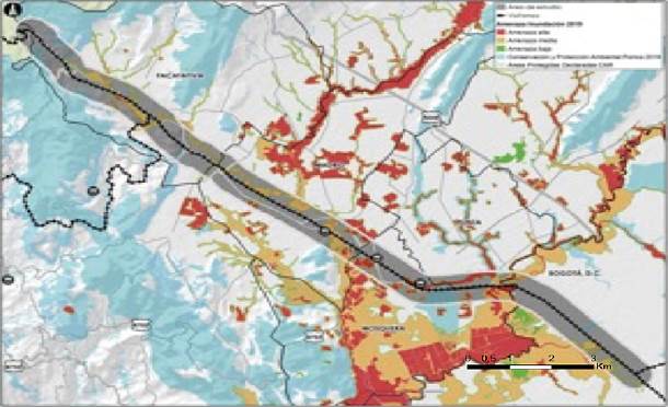Es importante tener en cuenta que no es solo la alta tasa de amenaza de inundación lo que podría afectar el proyecto. Si bien la amenaza promedio en el sector Facatativá es solo del 0.1 %, y las zonas de amenaza baja -ubicadas al este del municipio de Madrid y al noroeste del municipio de Facatativá- alcanzan solo el 10 %, estas condiciones, que hoy son tolerables, pueden aumentar en el futuro. El análisis predictivo de estas condiciones no es objeto de esta tesis, pero debería ser considerado en otros estudios.