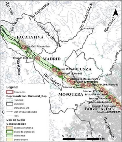 El resultado del análisis del área de influencia de la vía férrea muestra que, en cuanto a áreas de expansión y conservación, de las 8852.4 ha del área de estudio, 412.8 hacen parte del área definida como de expansión, de las cuales 1.03 -correspondientes al 0.3 % del área de expansión- son ambiguamente determinadas como áreas de conservación y expansión. Esta doble condición es sintomática de un uso irregular, que provoca dificultades en la definición operativa de las categorías de conservación y expansión. Esa ambigüedad debe aclararse antes de que el RegioTram entre en funcionamiento. El rigor en la definición de cada una de estas áreas producirá claridad en la determinación de usos y relaciones en el corredor del sistema de transporte.