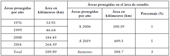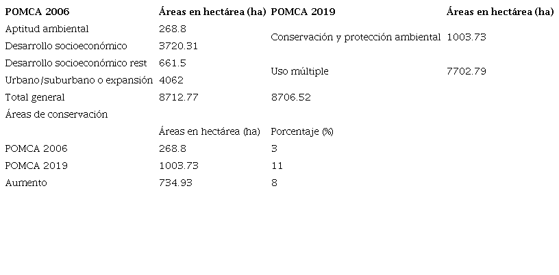 Se evaluó la intersección de las superficies de cada área de protección, identificando las afectaciones dentro del área de estudio. La tabla 1 especifica el año en que se calcularon las áreas protegidas. De la suma de las áreas protegidas encontradas dentro del área de estudio se determinó que dentro de las 8852.5 ha hay un total de 509.9 ha de áreas protegidas, que corresponde al 5.76 % del área total en estudio. Como resultado, se puede observar que, dentro del área de estudio, entre 1976 y 2019, las áreas netas de protección tuvieron un incremento del 3.4 %. Para obtener el porcentaje de área de conservación, según el POMCA, se utilizaron las categorías de idoneidad y conservación ambiental (2006) y protección ambiental (2019).