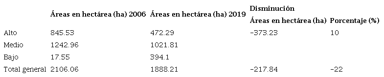 Para el 2006 se calculó un área total amenazada por inundaciones altas de 2106.06 ha, mientras que para el 2019 se estableció un área total de 1888.2 ha. Estos datos indican que las áreas de alta amenaza de inundación han disminuido (tabla 3).
