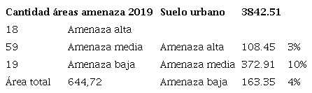 Al calcular la amenaza para el 2019 en la zona de expansión se encontró que el número de datos disponibles ha aumentado, se observa que el 12 % se encuentra en áreas catalogadas como áreas de amenaza en áreas de expansión. Hay 10 áreas de amenaza alta, 27 de amenaza media y 19 de amenaza baja, que resultan en un total de 161.4 ha, de las 412.7 identificadas como suelo de expansión.