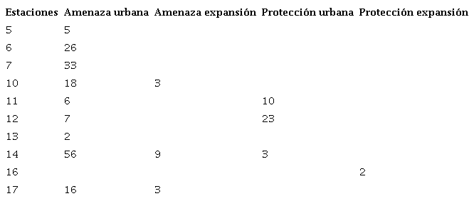 Esto se hizo para identificar los sectores críticos que podrían ser más afectados en los alrededores de los lugares donde se construirán las estaciones del RegioTram de Occidente. En la zona de influencia, en temporadas secas y húmedas, se revisaron las variables de amenaza de inundación en relación con las áreas de protección para el 2019. Al clasificar e insertar las variables en cada zona de amortiguamiento, se obtuvieron los resultados del porcentaje de áreas amenazadas en áreas urbanas, de expansión y zonas de protección en áreas urbanas y de expansión, cuyos resultados se presentan en la tabla 5.