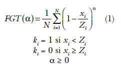 La intensidad, brecha y severidad de la pobreza se estiman mediante los indicadores FGT propuestos por Foster et al. (1984). Estos indicadores se construyen a partir de la relación entre los niveles de ingreso observados y el umbral de pobreza como se presenta en la ecuación (1).