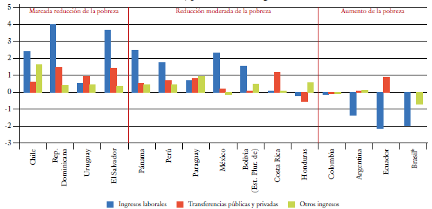 En la figura 1 también se observa el papel que jugaron las diferentes fuentes de ingreso en la evolución de la pobreza en la región. En buena medida, el incremento en el ingreso per cápita de los hogares estuvo acompañado de un importante papel de las transferencias públicas y privadas, sobre todo en los países en los que se redujo la pobreza. En el caso de Colombia, se observa que el papel de las transferencias fue nulo durante el periodo. Lo anterior evidencia que, a diferencia de los países en la región, en Colombia la política pública de transferencias monetarias para reducir la pobreza fue muy débil.