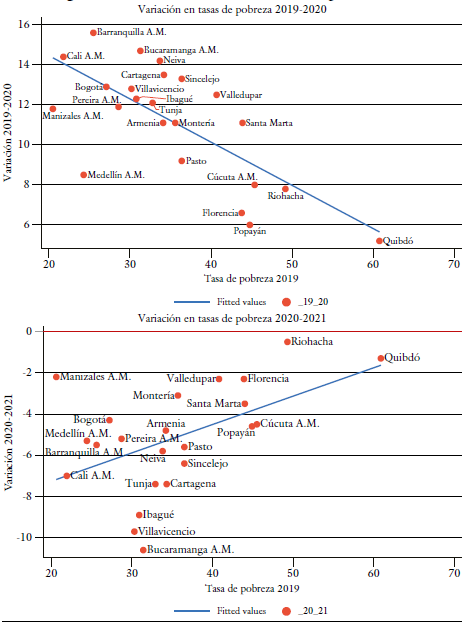 Los resultados sugieren que, durante el primer año de la pandemia, la pobreza aumentó más en las ciudades con menores niveles de pobreza en el 2019. Este es el caso de las grandes ciudades como Cali, Medellín, Barranquilla y Bogotá, y de otras ciudades como Manizales y Bucaramanga. Para el 2021, la pobreza se redujo más respecto del 2020 en las ciudades que presentaban menores niveles en el 2019. Este patrón indicaría que el aumento en la pobreza en el 2020 y la posterior reducción en el 2021 tuvo lugar principalmente en las grandes ciudades del país.