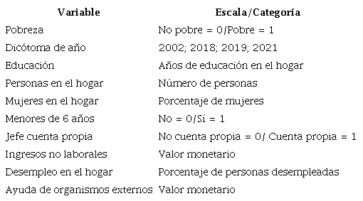Para hallar los efectos marginales de los factores determinantes sobre la pobreza, es necesario establecer el valor de la variable dependiente -y de las demás variables- a partir del cual se va a calcular tal efecto. Al considerar una relación no lineal entre las variables explicativas y la probabilidad de pobreza, el efecto marginal cambia en la media en que se consideren diferentes valores de las variables explicativas. El modelo se estimará tanto en conjunto como de forma individual para las 13 ciudades y áreas metropolitanas más importantes de Colombia. En la tabla 1 se presentan las variables a considerar en el modelo econométrico.