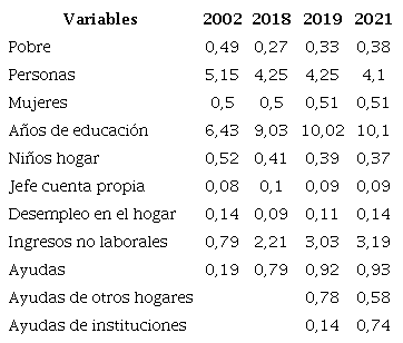 En la tabla 2 se presentan las estadísticas descriptivas de las variables usadas en el modelo econométrico. Según la tabla, a principios de la década del 2000, casi la mitad de la población en Colombia era considerada como pobre desde el punto de vista monetario. Durante el periodo 2002-2018, la tasa de pobreza se redujo hasta un 27 % y luego presentó una fase de ascenso que se aceleró con la llegada de la pandemia. Para el 2021 se ubicó en 38 %. Con relación a las variables explicativas, se observa que el número de personas y el número de niños en el hogar ha caído en el tiempo, mientras que los años de educación, los ingresos no laborales y las ayudas de hogares o instituciones ha aumentado. En particular, en el caso de las ayudas de instituciones, estas aumentaron del 2019 al 2020 como producto de los nuevos programas de transferencias condicionadas.