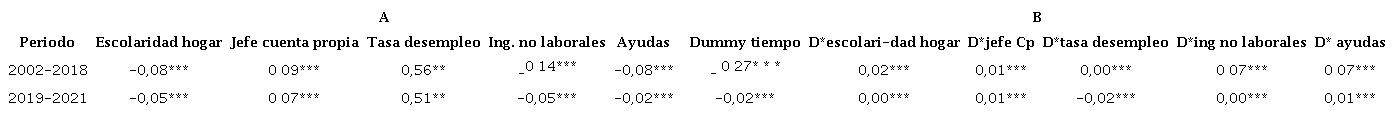 En la tabla 3 se presentan los efectos marginales de las variables explicativas consideradas en el modelo Logit. Por filas, se presentan estimaciones para dos periodos de tiempo: 2002-2018 y 2019-2021, mientras que por columnas se relacionan por paneles los efectos marginales de las variables de interés en el año inicial (panel izquierdo) y las estimaciones del efecto interacción entre la dummy de tiempo y la variable de interés (panel derecho). En consonancia con los resultados para el 2002 (panel A), los mayores niveles de escolaridad en el hogar, los mayores ingresos no laborales y los aumentos en las ayudas externas estuvieron asociados a menores niveles de pobreza.