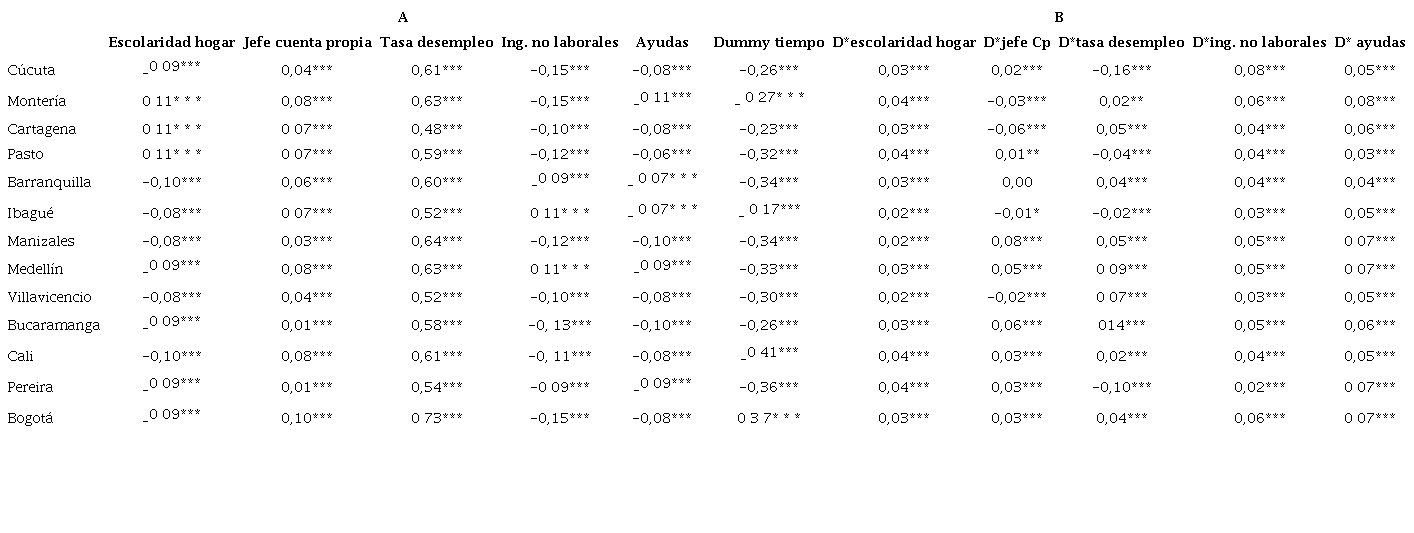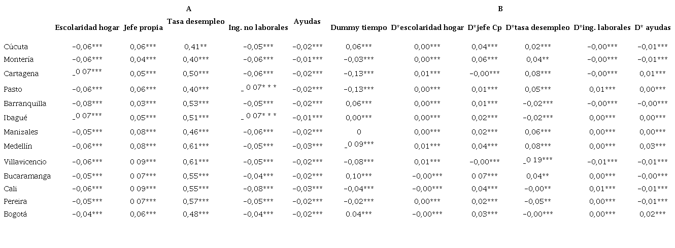 Los resultados econométricos sugieren que, durante el periodo de pandemia, los efectos marginales de la educación y los ingresos no laborales no tuvieron cambios significativos. El efecto interacción estimado fue nulo. Sin embargo, en el caso de las ayudas externas, el efecto marginal pasó de -0,02 a -0,01 -efecto interacción estimado de 0,01-. Es decir, las ayudas externas redujeron la pobreza durante la pandemia, pero a un ritmo decreciente. En el caso de las ciudades, el efecto marginal de las ayudas externas sobre la probabilidad de que el hogar sea pobre para el 2021, sigue siendo negativo y presenta pocas variaciones respecto de su valor en el 2019. En ciudades como Cúcuta, Montería, Villavicencio, Cali y Pereira, el efecto marginal aumentó levemente. En las otras ciudades no se reportó ningún incremento en el efecto marginal. De acuerdo con lo anterior, el trabajo sugiere como líneas futuras de investigación la evaluación de la focalización de los programas de ayudas institucionales y transferencias, y el impacto del monto transferido sobre la probabilidad de salir de la pobreza.