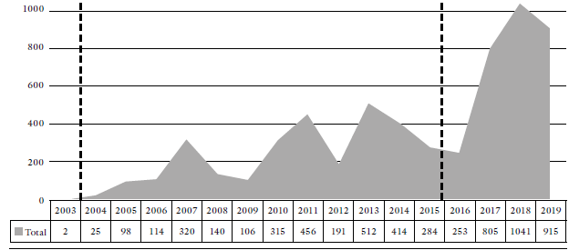Los tres cambios institucionales analizados fortalecieron la capacidad de incidencia de las veedurías, apoyándose en los organismos de control y auditoría en Colombia. El aumento de su capacidad de controlar las funciones públicas se ve reflejado en la serie de tiempo que elaboramos con base en el Registro de Veedurías Ciudadanas de la Personería Distrital de Bogotá (2022). En la figura 1 se ilustra la serie de tiempo y, con líneas discontinuas, los puntos de inflexión de los que hablamos en la sección anterior, a saber, la expedición de la Ley 850 de 2003, y el fin del período de reformas de transparencia en el 2015. La figura muestra el número de nuevos registros que ocurrieron en el período señalado, sin tener en cuenta el estado de actividad de las veedurías constituidas. En él podemos observar un incremento paulatino en el registro de nuevas veedurías ciudadanas a partir de la expedición de la Ley 850 de 2003 y un salto significativo a partir de la entrada en vigor del paquete normativo de lucha contra la corrupción.