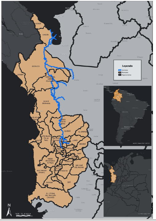 El río Atrato es el más caudaloso de Colombia, nace en el municipio de El Carmen de Atrato en el cerro El Plateado y desemboca en el Golfo de Urabá (figura 2). Su cuenca contiene una gran complejidad de ecosistemas, teniendo en cuenta que allí existe un alto índice de endemismo y una alta pluviosidad. La riqueza del río Atrato además se reconoce por su diversidad cultural que hace posible -y que se expresa en que sus rondas, esteros y maniguas-, sean el hábitat de poblaciones negras, indígenas y mestizas. En este sentido, el río configura un patrón de poblamiento que se caracteriza por la nuclearización de asentamientos humanos organizados de manera lineal por la geografía fluvial (Aprile-Gniset, 1993).