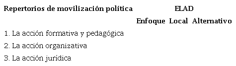 Como se mencionó, la propuesta de los ELAD surge de un proceso investigativo de ida y vuelta, entre la teoría y la práctica, en particular, desde la experiencia de vida de pobladores del Pacífico colombiano y la necesidad de búsqueda de visiones alternativas al desarrollo convencional. Esto es, de imaginarios de vida que vayan más allá de la idea de la extracción. Operativamente para avanzar en la relación entre los ELAD y algunos de los repertorios de movilización política de las y los Guardianes del río Atrato, se diseñó una matriz analítica de interrelación de los referentes conceptuales principales explicados en el anterior apartado. En la tabla 2 se presenta la matriz analítica.