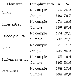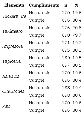 Los resultados de las tablas 1a y 1b muestran que, en promedio, el 80 % de los vehículos cumple adecuadamente con los seis factores analizados. También destacan la preocupación de los transportistas por cumplir con las disposiciones y condiciones para el correcto funcionamiento de cada unidad. Adicionalmente, hay que indicar que los vehículos que no cumplen con gran parte de los elementos revisados por la autoridad de transporte no obtienen el permiso de circulación.