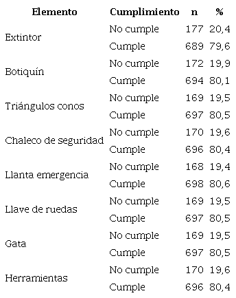 La tabla 2 muestra los elementos de seguridad que cada unidad debe poseer de manera obligatoria como parte de los requisitos para obtener la matrícula anual de funcionamiento.