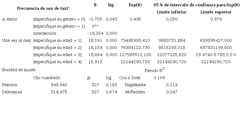 Por otra parte, cuando se analiza la frecuencia de uso de taxi en la ciudad de Ibarra, condicionada por la respuesta una vez al mes, se aprecia que esta respuesta se ve afectada de manera positiva significativa (p < 0,05). Por los rangos de edad, los coeficientes son positivos y casi no presentan mayores diferencias entre un rango y otro; sin embargo, de analizarse con detalle, se podría decir que pertenecen al rango de edad uno y tres, e incrementa en mayor medida la probabilidad de tomar un taxi al menos una vez al mes. El rango de edad dos, si bien incrementa la probabilidad de usar taxi, no lo hace de la misma manera que los anteriores.