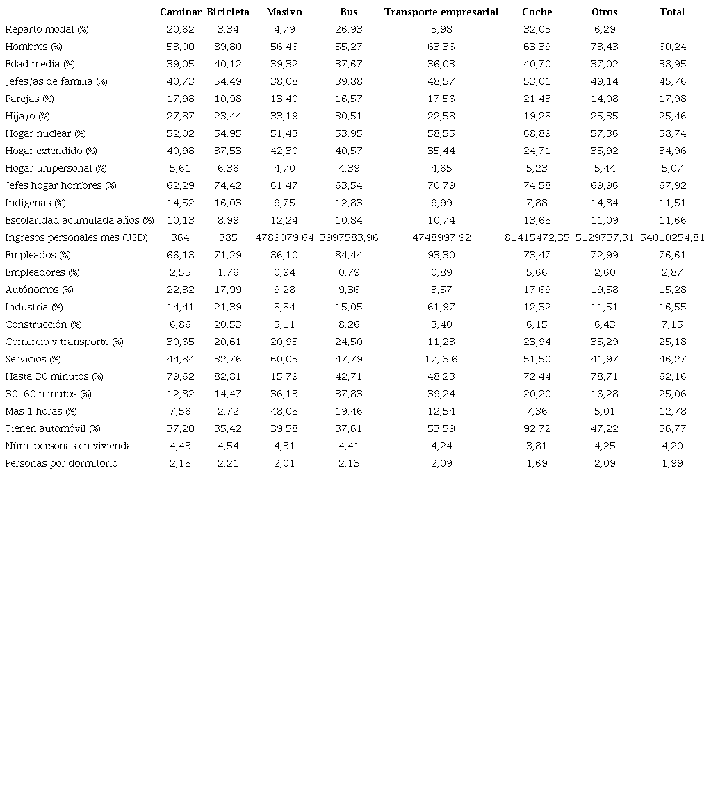 Se advierte en la tabla 1 que había una proporción mayor de hombres entre los usuarios del automóvil (63,39 %), en comparación con el conjunto de todos los trabajadores (60,24 %). Entre estos usuarios, había también una mayor proporción de jefes de familia (53,01 %) o de sus parejas (21,43 %), dentro de hogares nucleares (68,89 %), con más años totales de escolaridad (13,68 años), y un mayor ingreso mensual (814 USD). Dentro de los trabajadores que se desplazaron en automóvil, existía una mayor proporción de empleadores (5,66 %) y autónomos (17,69 %), en contraste con las medias globales (2,87 % y 15,28 %, respectivamente).