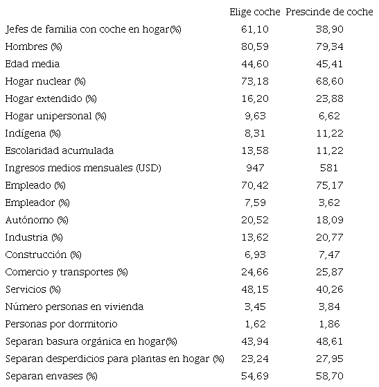 La comparación de quienes lo usaron y quienes prescindieron de este arroja perfiles notoriamente distintos. No se encontraron prácticamente diferencias según género y edad. Sin embargo, los que usaron el automóvil vivían proporcionalmente más en hogares nucleares (73,18 % frente a 68,80 % de quienes no lo usaron), existía entre ellos un menor número de personas autodeclaradas como indígenas (8,31 % frente a 11,22 %), tenían mayor escolaridad (13,58 años contra 11,22), y un ingreso notablemente mayor (947 USD en contraste con 581 USD que ganaron quienes no lo seleccionaban).