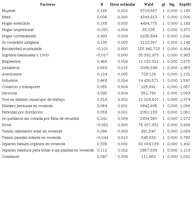 Los coeficientes parciales de cada uno de los factores fueron significativos. El coeficiente más elevado fue el que correspondió a los jornaleros (Exp[B] = 1,953), lo que implica que ser jornalero aumentó 1,953 veces las probabilidades de prescindir de coche en el viaje al trabajo respecto a los empleadores. En general, este coeficiente fue un buen indicador de que los jefes de familia, en hogares con automóvil, y que vivían en una peor condición socioeconómica, tuvieron más probabilidades de no usar ese automóvil para ir al trabajo. Así, se observó también que el considerarse indígena incrementó un 14,5 % las probabilidades de prescindir de coche frente a los no indígenas, cada año extra de escolaridad disminuyó las probabilidades de prescindir de coche en un 9,6 %, el aumentar 53 USD ingreso mensual implicó reducir las posibilidades de prescindir de coche en un 1,7 %, cada persona extra en la vivienda aumentó la probabilidad de prescindir del coche en un 6,6 %, cada persona más por dormitorio en la vivienda incrementó esa misma probabilidad en un 6,1 %, y haberse quedado sin comida por falta de recursos implicó incrementar un 27,2 % la probabilidad de no usar el coche en el desplazamiento al trabajo. Asimismo, trabajar en la industria representó tener 1,597 veces más de opciones de prescindir de coche para viajar al trabajo, en comparación con las personas que trabajaban en los servicios.
