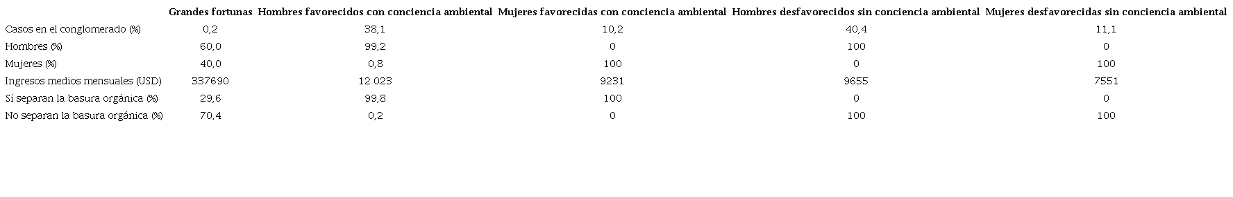 Los dos conglomerados restantes fueron un grupo de hombres y otro de mujeres, que eran más desfavorecidos desde el punto de vista de sus ingresos, y que no mostraban conciencia ambiental, al no separar ninguno de sus integrantes la basura. En estos dos grupos, el factor "bajos ingresos" sería el que explicara su inclusión como jefes de hogar, con automóviles en casa, pero que no lo usan para viajar a sus trabajos.