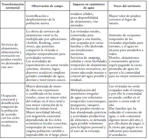 A partir de observaciones de campo en zonas rurales de Colombia y del testimonio de líderes y lideresas entre 2021 y 2022 (véase tabla 1), se sintetizaron tendencias o transformaciones de la vida rural con mayor impacto en el suministro de agua y en la gestión de los acueductos comunitarios urbano-populares y rurales de los departamentos del Cauca, Cundinamarca, Quindío, Risaralda y Valle del Cauca. Así, las áreas caracterizadas en este estudio se ubican en la región Andina de Colombia, son próximas a grandes y medianos centros urbanos y cuentan con posibilidades de oferta turística y de cultivos de alimentos de alta demanda. Por ello, los cambios identificados no reflejan realidades de otras regiones del país, o de las zonas más apartadas de estos departamentos (tabla 5).