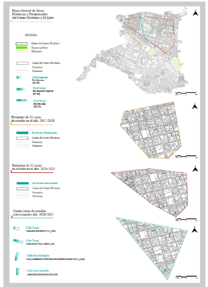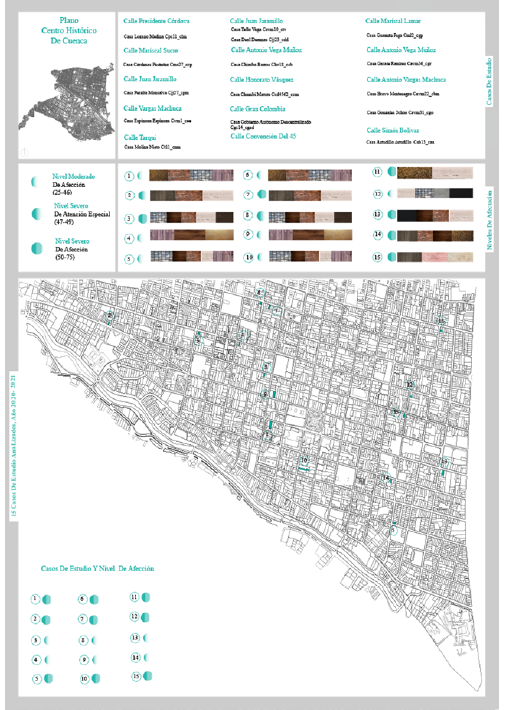 Este segmento supone una etapa concluida, cuyos particulares únicamente buscan evidenciar la utilidad del segmento desarrollado a detalle en la presente investigación, es decir, el diagnóstico entre 2020 y 2021. La investigación entre 2017 y 2018 consideró describir una aproximación sobre el deterioro de las fachadas patrimoniales, sin llegar a cerca de las tres mil edificaciones patrimoniales o al total de las áreas históricas y patrimoniales (Aguirre Ullauri et al., 2018, 2020a, 2020b; Aguirre Ullauri, 2021), ya que sería poco viable. Además, se consideraron otros particulares para seleccionar los 35 casos de estudio (figura 1), a saber: