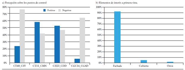 A nivel de la percepción visual y estética de las edificaciones, el 92 % de los encuestados se enfoca en la fachada, mientras el resto en elementos arquitectónicos como la cubierta, o en rasgos particulares como los colores o texturas (figuras 4 y 10b). También se estableció que el 57 % de los encuestados manifiesta que el estado de conservación es bueno, el 5 % excelente y el 38 % medianamente bueno. A su vez, en cuanto a la percepción específica de los puntos de control, se obtuvieron los resultados mostrados en las figuras 4 y 10a.