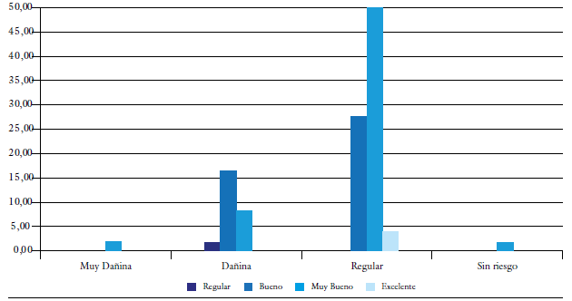 Según la percepción de los encuestados, asociada con las envolventes patrimoniales en relación con la calidad del ambiente, se define que el 55 % de los encuestados opina que la conservación es muy buena, de los cuales el 45 % tiene la percepción de que la calidad ambiental es regular, el 7 % opina que es dañina y el 3 % restante indica que la calidad ambiental no representa riesgo. Quienes omiten otras opiniones, dicen que es muy dañina. En complemento, el 40 % de los participantes indica que la conservación es buena, de los cuales el 25 % perciben calidad ambiental regular, y el 15 %, dañina. Finalmente, para el 5 % restante la conservación es excelente, es regular para el 3 %, y la conservación es regular con una calidad ambiental dañina para el 2 % (figura 11).