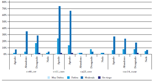 Con el objeto de profundizar y conocer la percepción de la población, sobre la incidencia de los elementos naturales en los puntos de control, se evaluó la relación entre la sensación que transmiten los elementos arquitectónicos en su fachada y la calidad ambiental. Bajo lo señalado, los puntos de control CT40_CSV y CGC14_CGAD son los más afectados y tienen similar tendencia a la sensación de desagrado y abandono. Se considera que la calidad del ambiente es dañina; sin embargo, los valores más altos se encuentran en nivel moderado (figura 12).