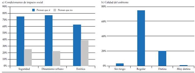 Consecuente con lo previo, el 62 % de los encuestados cree que la estética de las edificaciones influye a nivel urbano en el CHC, y el 38 %, lo hace a nivel moderado. Así mismo, el 75 % asocia el deterioro de las edificaciones patrimoniales con la seguridad y el dinamismo urbano, mientras los restantes no consideran la existencia de relación alguna (figuras 4 y 13a). Además, el 76 % considera que la calidad ambiental del CHC es regular, a diferencia del resto, que cree es dañina o mala (figuras 4 y 13b). Según esto, los principales contaminantes son el vandalismo (75 %), los gases de combustión (55,40 %), el clima (8,90 %) y las obras públicas (25 %). Cabe indicar que existen múltiples coincidencias entre los participantes al identificar estos factores (figura 4).