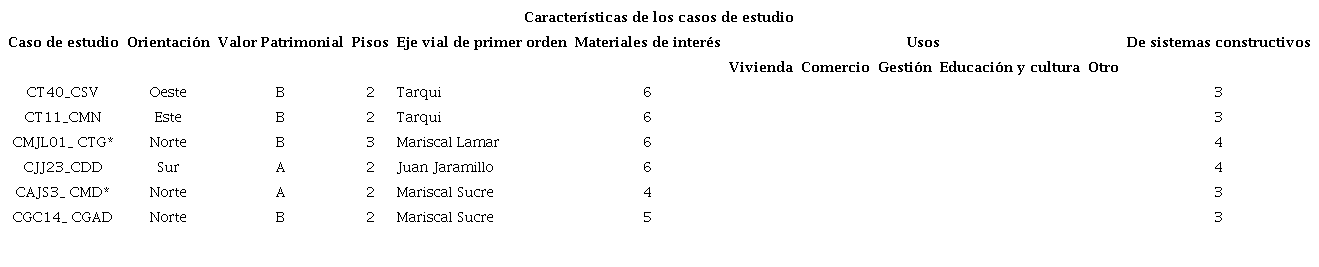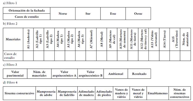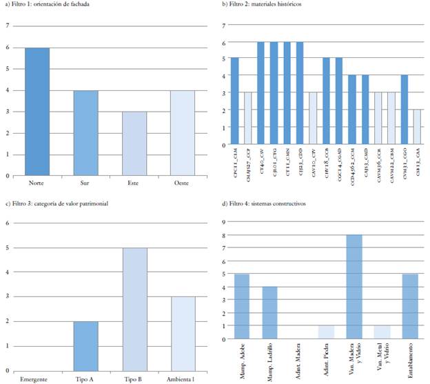 Sobre los edificios enmarcados en las categorías de interés se aplicaron cuatro filtros o procesos de priorización. El primero es la orientación de fachada con respecto a los puntos cardinales (tabla 1a); el segundo, la cantidad de materiales históricos coincidentes con el universo de estudio (tabla 1b); el tercero, el sistema constructivo (tabla 1c), y, el cuarto, la categoría de valor patrimonial asignada por la Ordenanza para la Gestión y Conservación de las Áreas Históricas y Patrimoniales del Cantón Cuenca, vigente desde 2010 (tabla 1d).