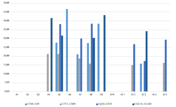 Al concretar la comparación entre la situación del periodo 2017-2018 y 20202021, se evidencia que para obtener información de las envolventes patrimoniales es prioritario el uso de fichas arquitectónicas unificadas bajo la óptica del moni-toreo activo, es decir, con la capacidad de aplicar, actuar y establecer directrices claras sobre la gestión y, a su vez, poder aplicarse a diario por los agentes competentes (Andrade, 2011). De tal forma, al haber transcurrido dos años desde el primer momento de análisis, los materiales evaluados entre 2020 y 2021 no han sufrido deterioro visible al ojo humano, lo cual no descarta la existencia de este. Incluso, algunos materiales presentan menores áreas de afección, estos son: A9 (-12,96 %), A4 (-53,42 %), A5 (-34,05 %), A7 (-48,40 %), A8 (-37,66 %), A15 (-48,29 %) y A12 (-52,43 %). En oposición, únicamente A6 experimenta un incremento del 3,71 %.