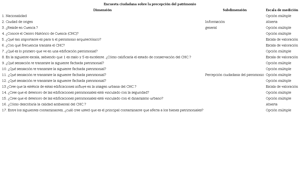 Finalmente, en el caso de Cuenca, la gobernanza urbana y la toma de decisiones de abajo a arriba constituyen un referente nacional (Rey & Tenze, 2018). Esto se debe a la implementación de la Recomendación sobre el Paisaje Urbano Histórico (Unesco, 2011). Si bien no se trata de una aproximación directa a la percepción sobre el deterioro de las fachadas patrimoniales, sí lo es para poner en común las visiones que afectan la conformación del conjunto urbano (Rey & Tenze, 2018); por tanto, se comprenden como parte del ecosistema en el cual el ciudadano coexiste con el patrimonio y los diferentes factores que determinan o no su conservación. En conjunto, estos forman parte del paisaje del asentamiento y han interactuado en tiempo y espacio.