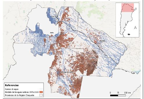 Parte de dichos territorios, como la Región Chaqueña aquí trabajada, se encuentran degradados a raíz de las transformaciones en los suelos y clima, y su población ha sido arrinconada sin acceso a tierras productivas ni fuentes de agua segura para el consumo y uso ( Castilla & Schmidt, 2021 ). Así mismo, las transformaciones climáticas y de suelos también interfieren en la utilización y cantidad de agrotóxicos destinados a los cultivos del agronegocio, al igual que la utilización de bienes como el agua, sobre todo en una ecorregión con una fuerte escasez hídrica como es la Chaqueña.