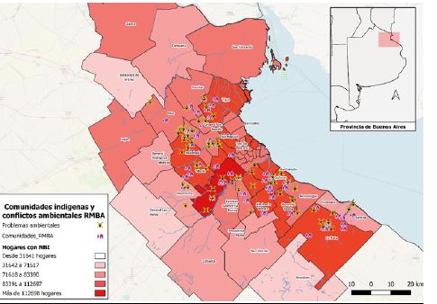 En un estudio —aún en curso— hemos buscado y sistematizado más de 200 fuentes —principalmente noticias periodísticas— y trabajos académicos, con el objetivo de mapear dichos conflictos en la región, atendiendo principalmente a aquellos que se encuentran cerca de comunidades originarias registradas por el Consejo Provincial de Asuntos Indígenas de Buenos Aires (figura 2). En este sentido, en un primer avance sobre este mapeo, que todavía queda por actualizar, hemos encontrado que se registran más de 65 conflictos ambientales en áreas atravesadas por cuencas hídricas, y con altos niveles de necesidades básicas insatisfechas en la región.