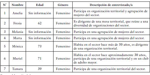 En el caso de la Unidad Vecinal (uv) Arturo Prat (tabla 1), efectuamos siete entrevistas semiestructuradas. La muestra fue intencionada ( Flick, 2007 ) bajo el criterio principal de que fueran habitantes del territorio y que hubieran participado en actividades del trabajo de articulación vecinal descrito anteriormente, tanto dirigentes como vecinas.